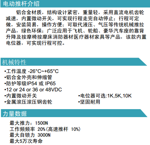 鋁合金材質(zhì),結(jié)構(gòu)設(shè)計(jì)緊密,重量輕,采用直流電機(jī)齒輪減速,內(nèi)置微動(dòng)開關(guān),可實(shí)現(xiàn)行程走完自動(dòng)停止;行程可定做,安裝簡易,操作方便;可取代液壓、氣壓等傳統(tǒng)機(jī)械推拉產(chǎn)品,綠色環(huán)保;廣泛應(yīng)用于飛機(jī)、輪船、豪華汽車座的靠背升降及按摩椅按摩床消防器材醫(yī)療器材家具等產(chǎn)品,該款內(nèi)置電位器,可實(shí)現(xiàn)行程可控。
