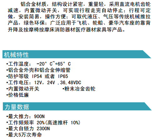 鋁合金材質(zhì),結(jié)構(gòu)設(shè)計(jì)緊密,重量輕,采用直流電機(jī)齒輪 減速,內(nèi)置微動(dòng)開關(guān),可實(shí)現(xiàn)行程走完自動(dòng)停止; 機(jī)械特性:
